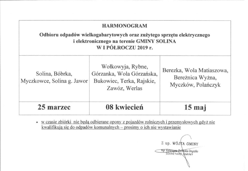 Odbioru odpadów wielkogabarytowych oraz zużytego sprzętu elektrycznego i elektronicznego na terenie Gminy Solina w I półroczu 2019 roku.
