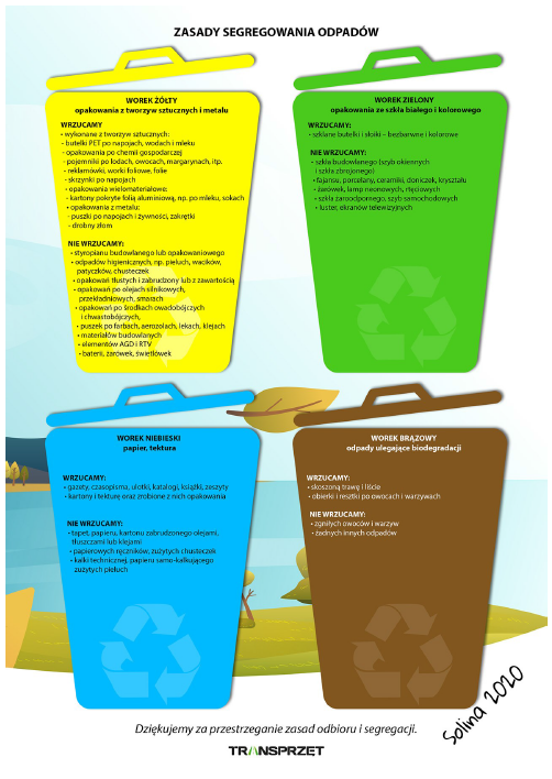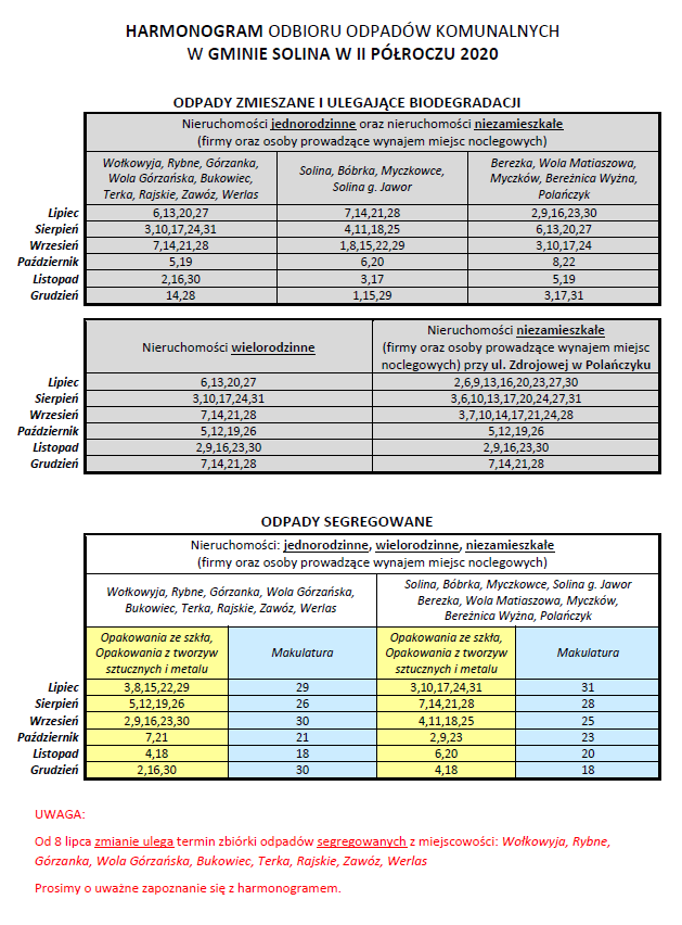 Harmonogram odbioru odpadów komunalnych w Gminie Solina 2020