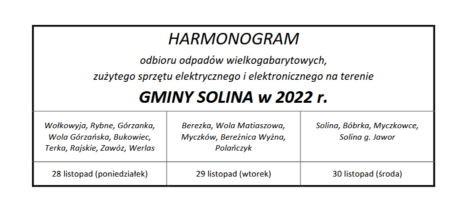 Należy przygotować do odbioru odpady wielkogabarytowe (OPRÓCZ OPON) oraz zużyty sprzęt elektryczny i elektroniczny. Odbiór będzie zrealizowany według załączonego harmonogramu, w wyznaczony dzień, z posesji.
