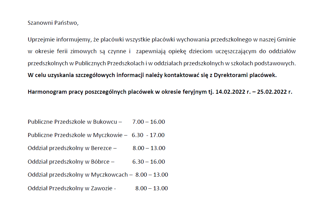 Harmonogram pracy placówek wychowania przedszkolnego w okresie feryjnym