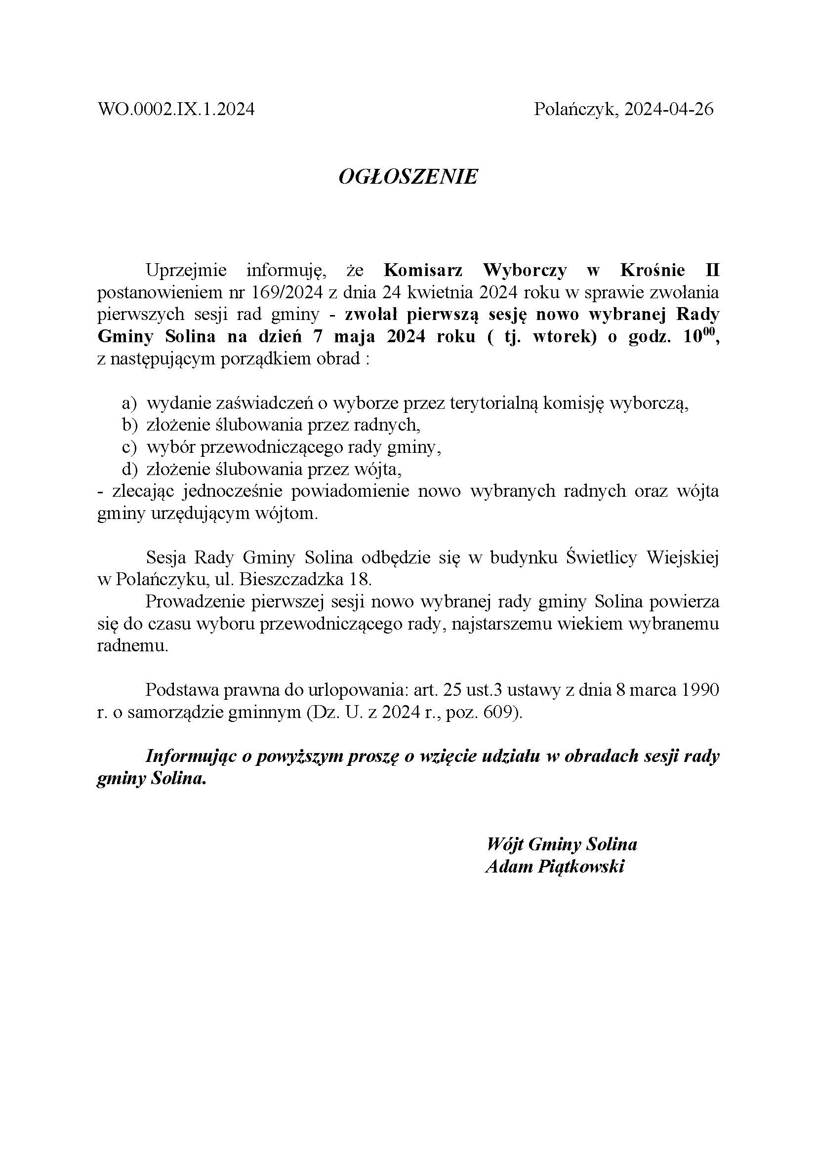 Obwieszczenie Wójta Gminy Solina z dnia 24 stycznia 2025 r.