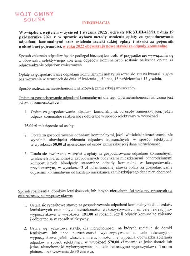 W związku z wejściem w życie od 1 stycznia 2022 r. uchwały NR XLIII/428/21 z dnia 19 października 2021 r. w sprawie wyboru metody ustalenia opłaty za gospodarowanie odpadami komunalnymi oraz ustalenia stawki takiej opłaty i stawki za pojemnik o określonej pojemności, w roku 2022 obowiązują nowe stawki za odpady komunalne.