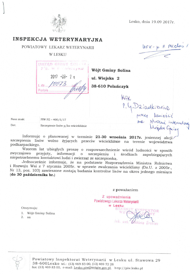 Informacja o terminie planowanej jesiennej akcji szczepienia lisów wolno żyjących przeciw wściekliźnie