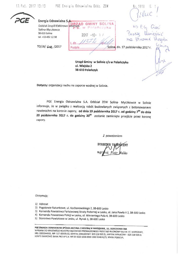 o zamknięciu przejścia przez koronę zaporę w związku z realizacją robót budowlanych