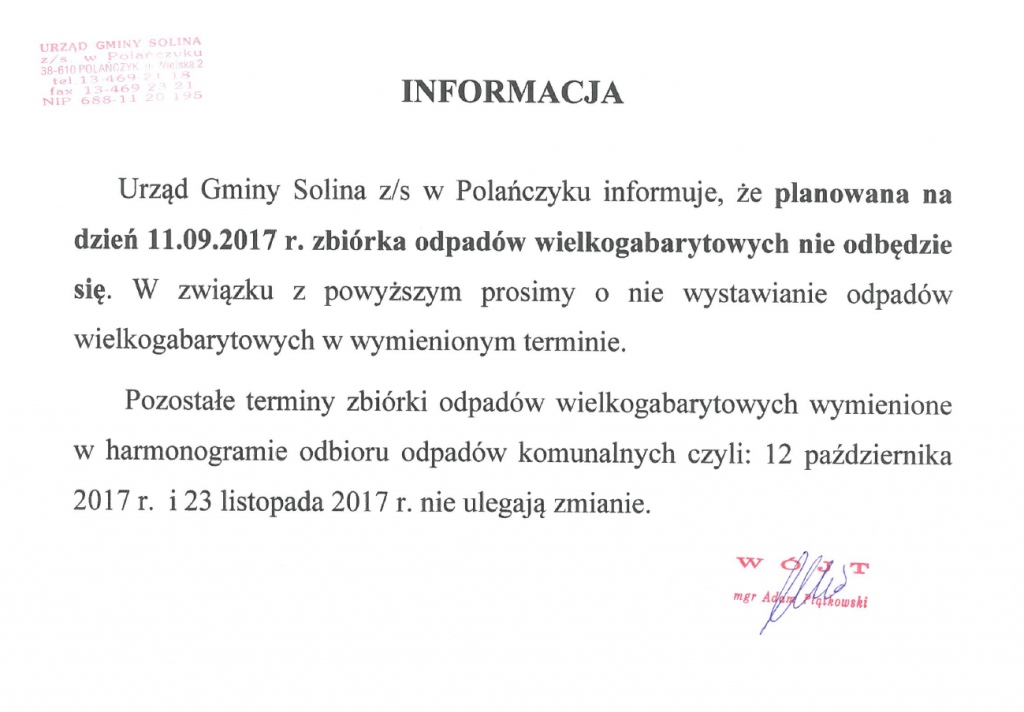 o odwołaniu terminu zbiórki odpadów wielkogabarytowych