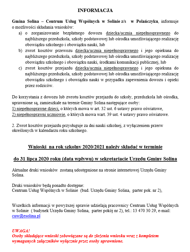 o możliwości składania wniosków o zorganizowanie bezpłatnego dowozu dziecka/ucznia niepełnosprawnego do najbliższego przedszkola, szkoły podstawowej lub ośrodka umożliwiającego realizację obowiązku szkolnego i obowiązku nauki