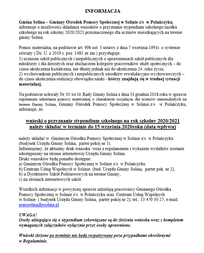 o możliwości składania wniosków o przyznanie stypendium szkolnego/zasiłku szkolnego na rok szkolny 2020/2021 przeznaczonego dla uczniów mieszkających na terenie gminy Solina.
