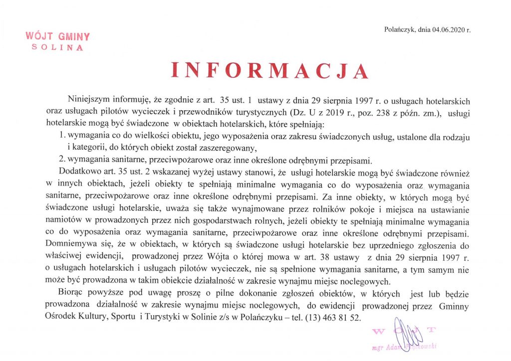 dotycząca zgłoszeń obiektów, których jest lub będzie prowadzona działalność w zakresie wynajmu miejsc noclegowych