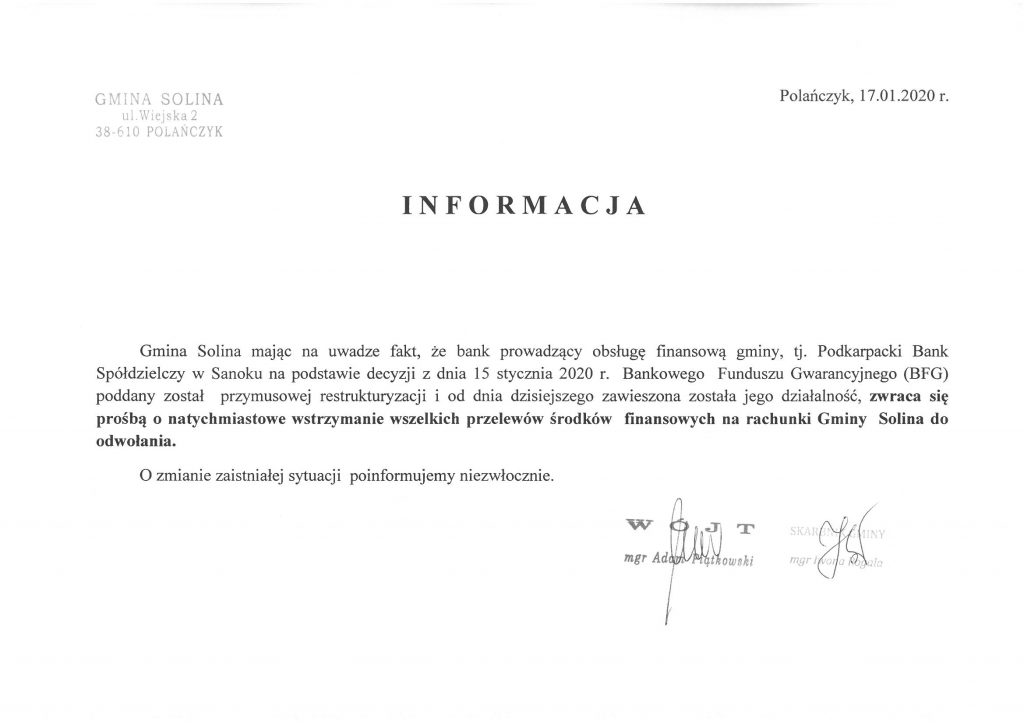 Dotyczy wstrzymania wszelkich przelewów środków finansowych na rachunki Gminy Solina