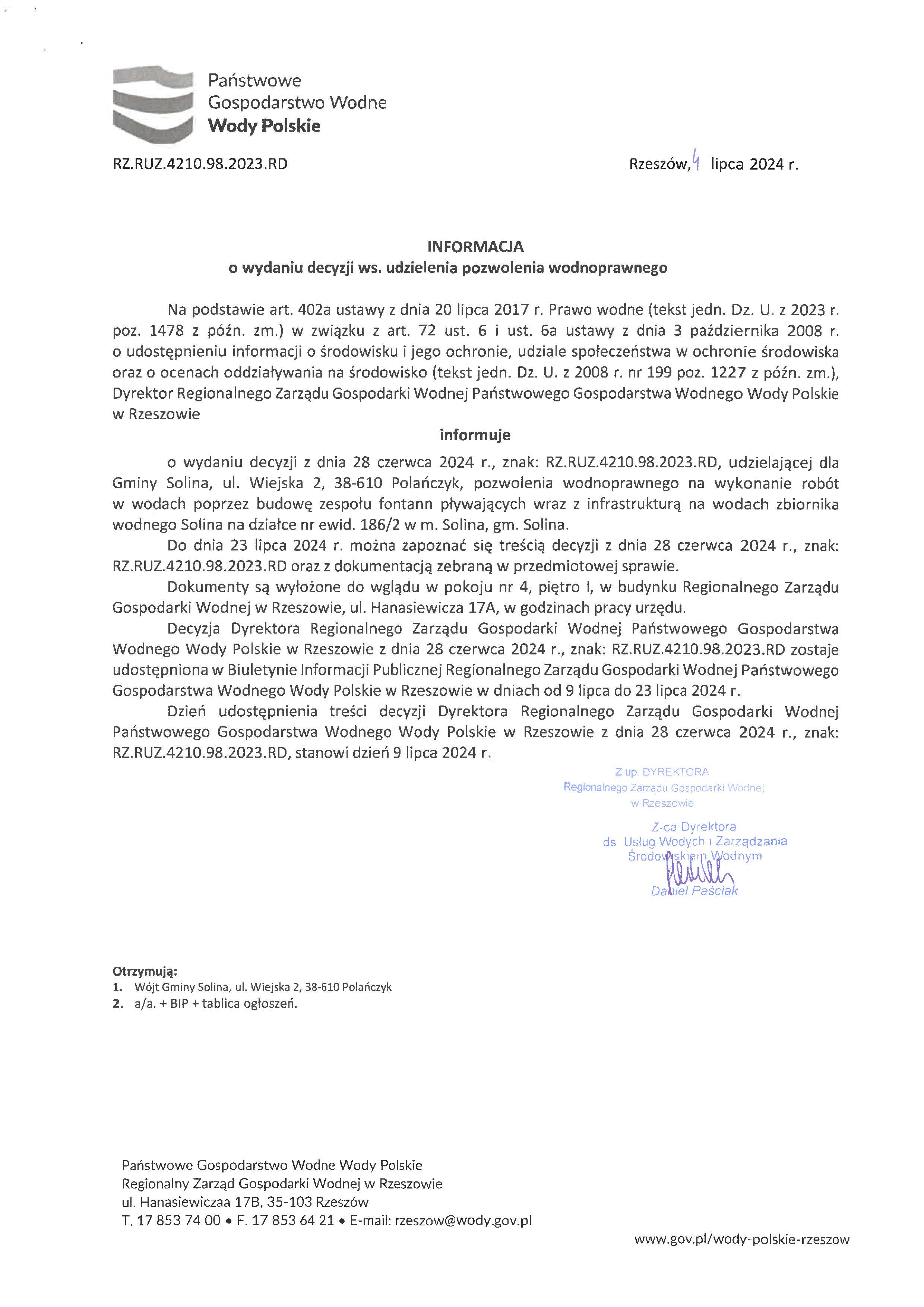 Informacja Dyrektora Regionalnego Zarządu Gospodarki Wodnej Państwowego Gospodarstwa Wodnego Wody Polskie w Rzeszowie