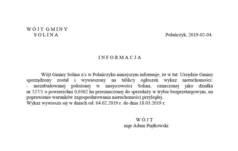 Obwieszczenie Wójta Gminy Solina z dnia 24 stycznia 2025 r.