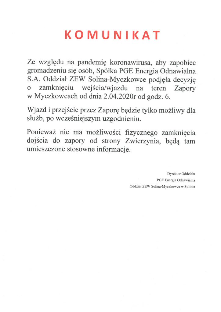 Dotyczy zamknięcia wejścia/wjazdu na teren Zapory w Myczkowcach