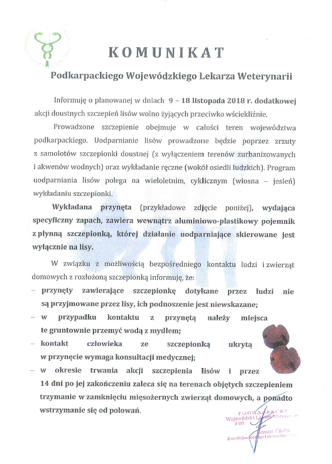 Podkarpackiego Wojewódzkiego Lekarza Weterynarii w sprawie planowanej dodatkowej akcji doustnych szczepień lisów wolno żyjących przeciwko wściekliźnie.
