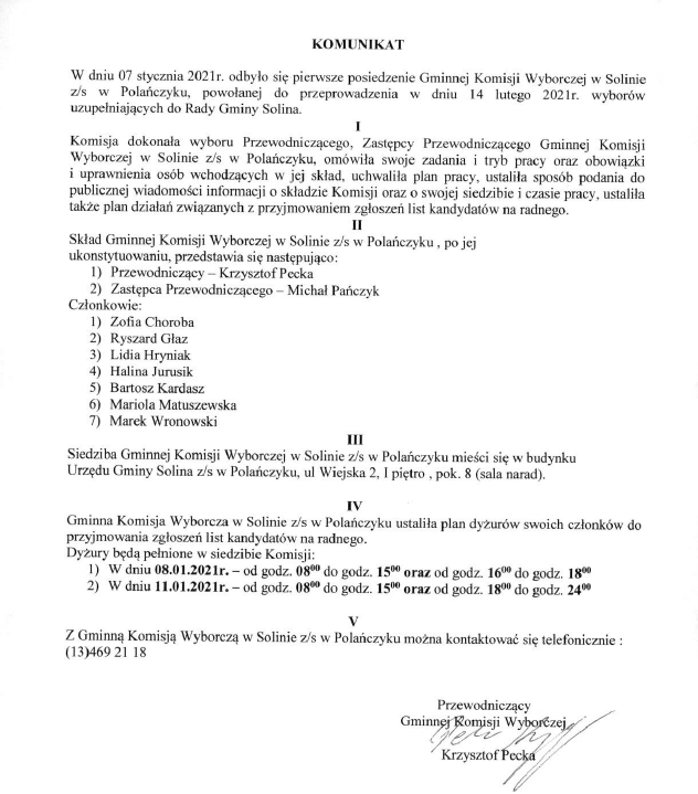 dotyczący dyżurów Gminnej Komisji Wyborczej w Solinie z/s w Polańczyku, powołanej do przeprowadzenia w dniu 14 lutego 2021 r. wyborów uzupełniających do Rady Gminy Solina.