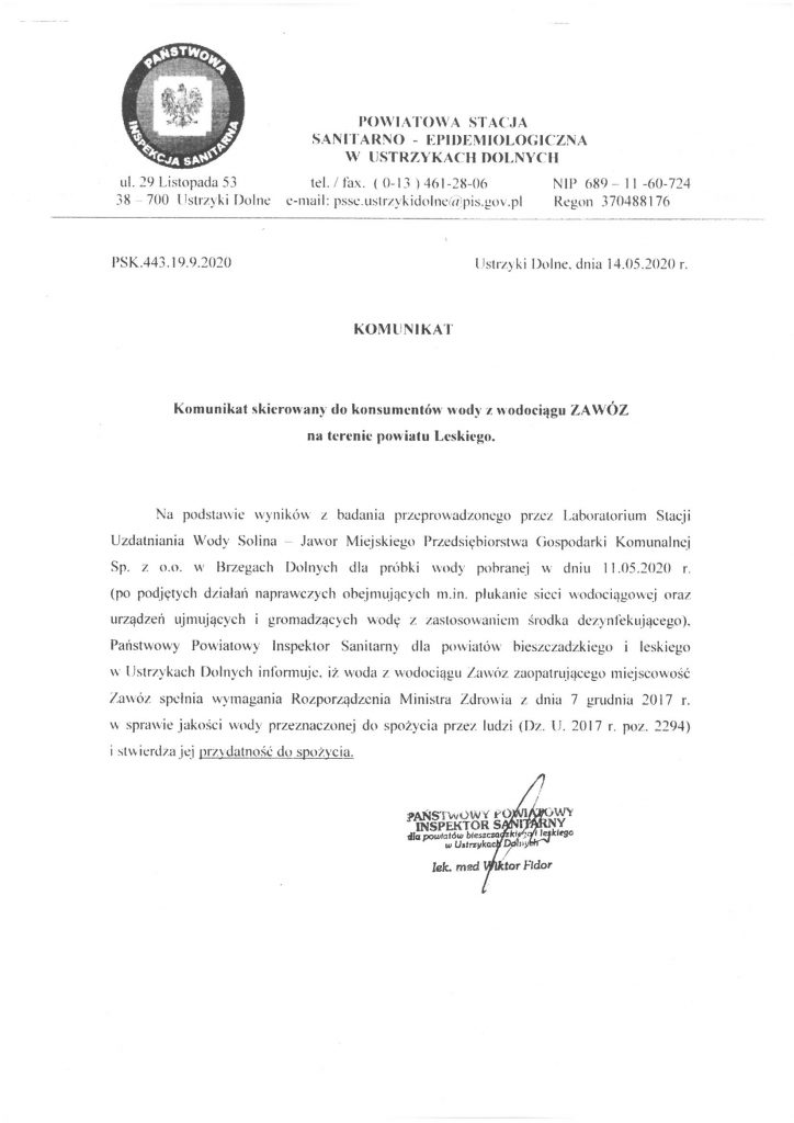o przydatności wody do spożycia z wodociągu ZAWÓZ
