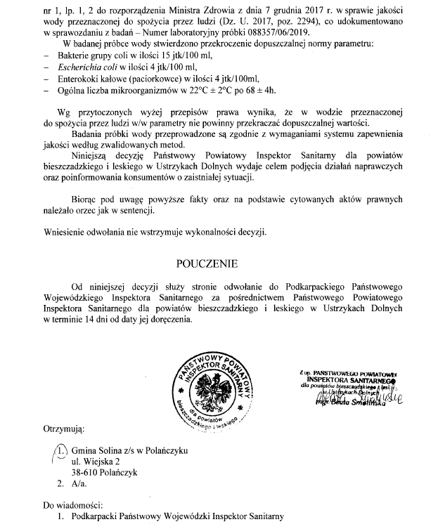 o braku przydatności wody do spożycia z wodociągu Werlas
