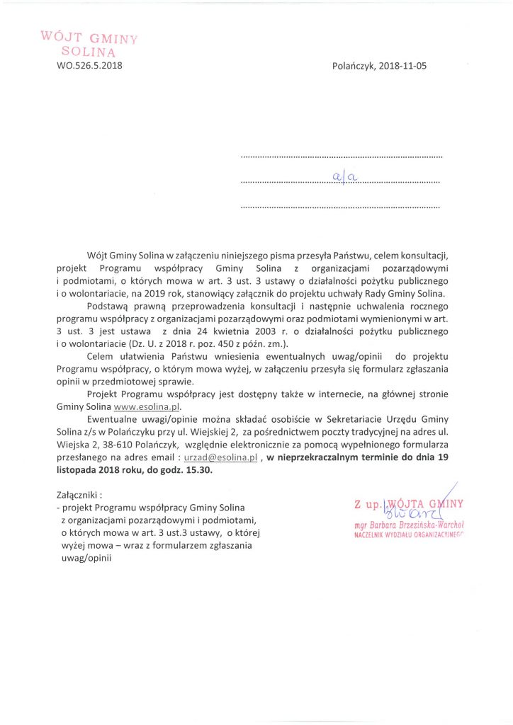 projektu Programu współpracy Gminy Solina z organizacjami pozarządowymi i podmiotami, o których mowa w art. 3 ust. 3 ustawy o działalności pożytku publicznego i o wolontariacie, na 2019 rok