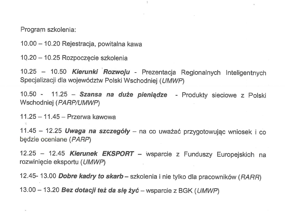 Podczas spotkania, w którym będą uczestniczyć eksperci Polskiej Agencji Rozwoju Przedsiębiorczości, Urzędu Marszałkowskiego Województwa Podkarpackiego oraz Rzeszowskiej Agencji Rozwoju Regionalnego/ Operatora Bazy Usług Rozwojowych zostaną przedstawione aktualne działania skierowane do mikro, małych i średnich przedsiębiorców z tereny makroregionu Polski Wschodniej. Będzie także możliwość wymiany doświadczeń między uczestnikami oraz zostaną przedstawione praktyczne aspekty aplikowania po wsparcie unijne.