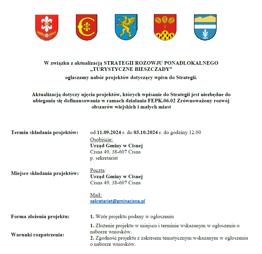 Nabór projektów do Strategii Rozwoju Ponadlokalnego „TURYSTYCZNE BIESZCZADY”