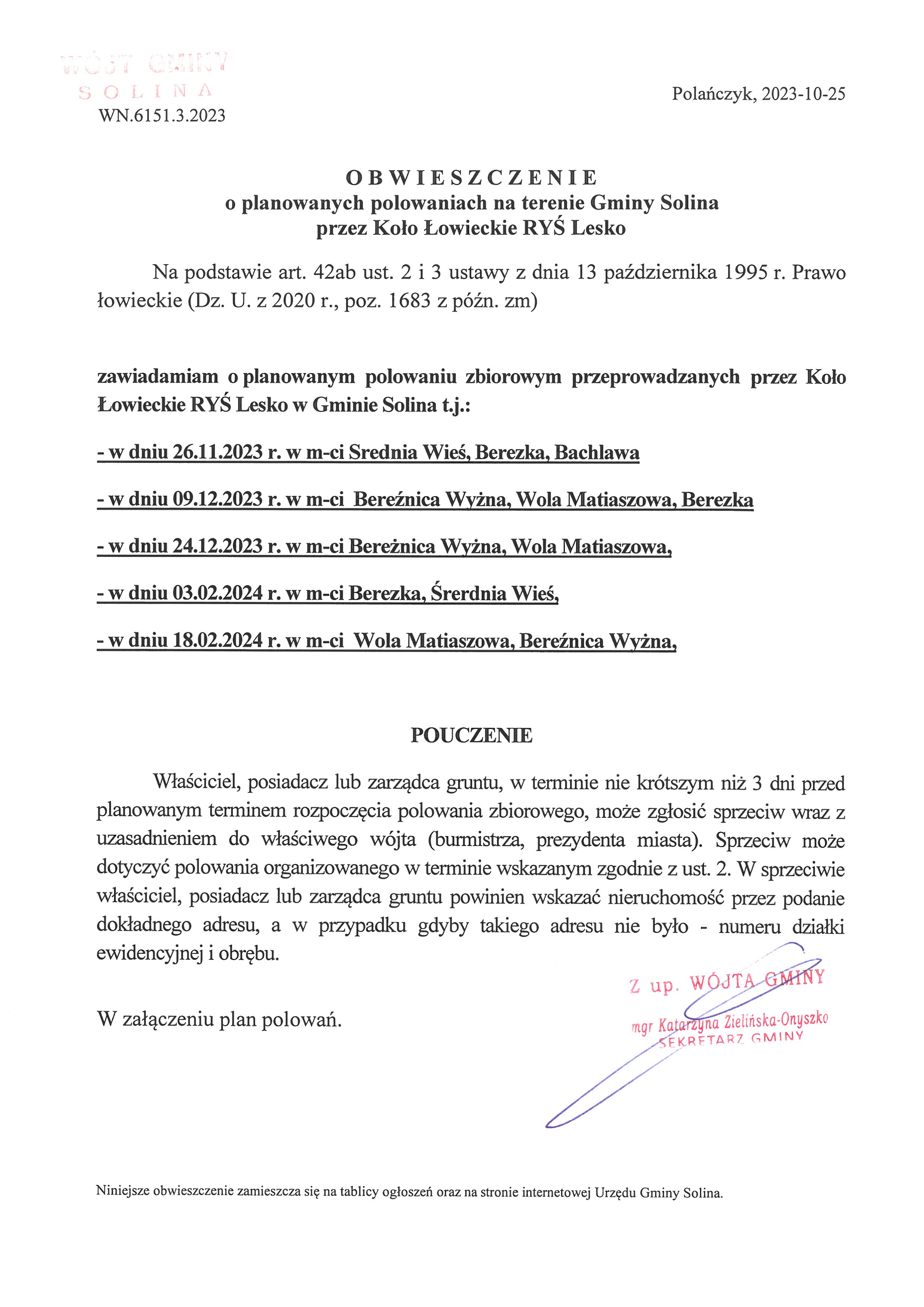 Obwieszczenie o planowanych polowaniach na terenie Gminy Solina przez Koło Łowieckie RYŚ Lesko