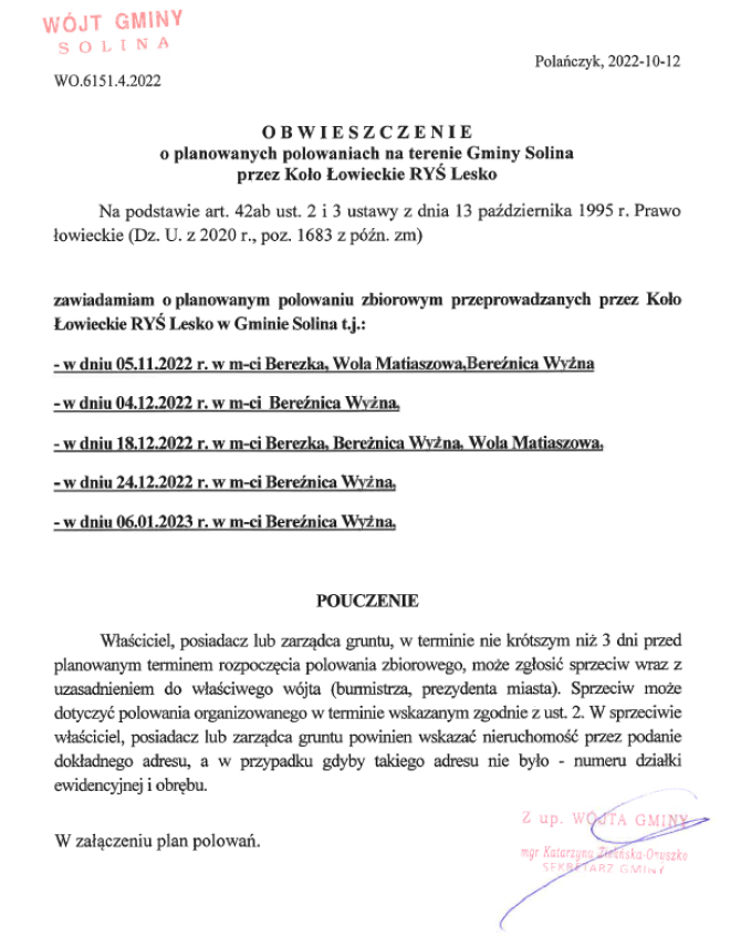 z dnia 12 października 2022 r. o planowanych polowaniach na terenie Gminy Solina przez Koło Łowieckie RYŚ Lesko