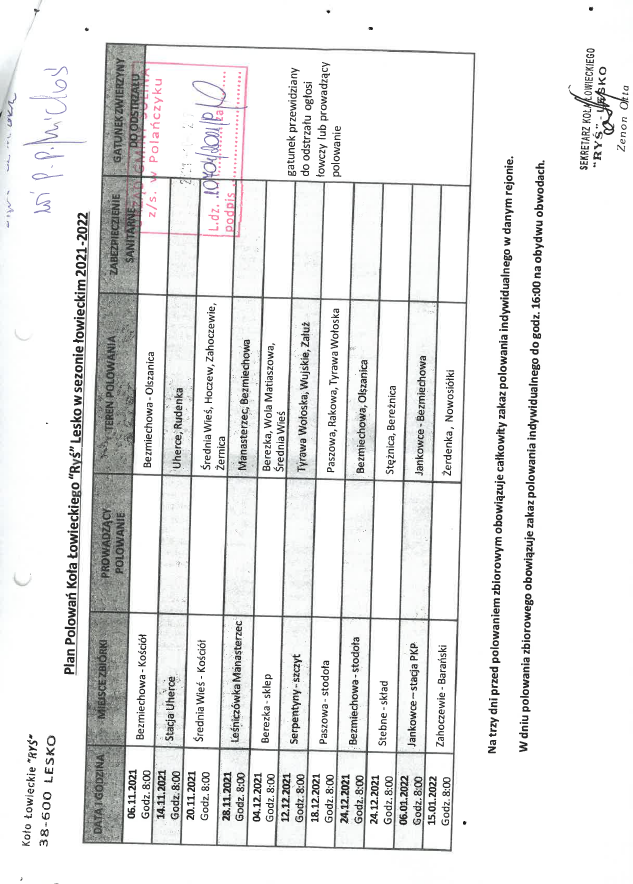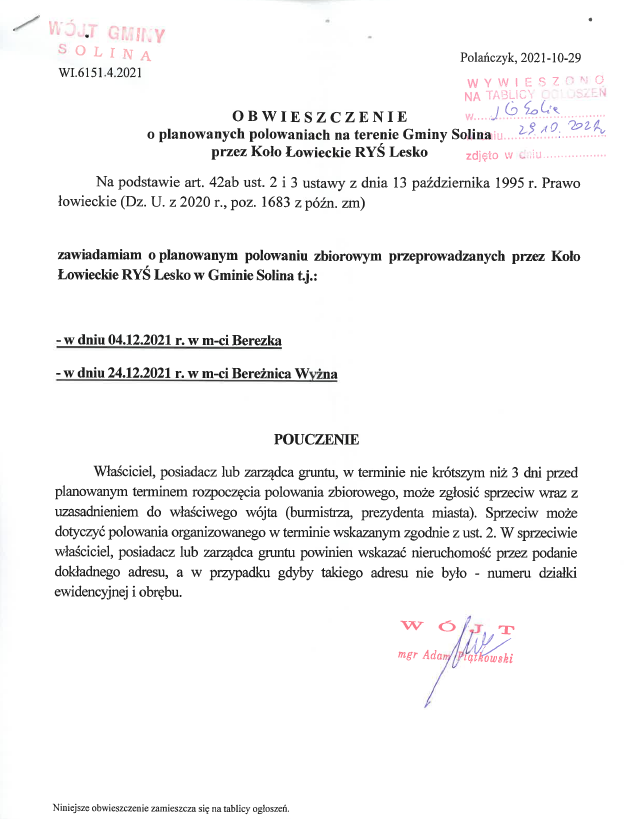 o planowanych polowaniach na terenie Gminy Solina przez Koło Łowieckie RYŚ Lesko