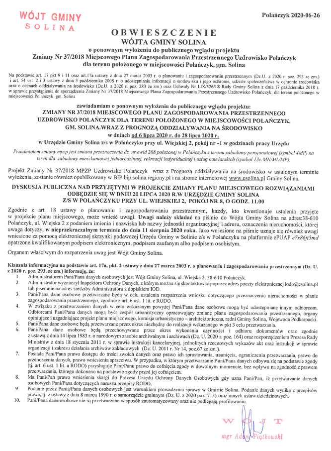 Obwieszczenie Wójta Gminy Solina z dnia 26 czerwca 2020 r.