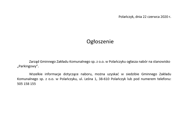 o naborze na stanowisko „Parkingowy” w Gminnym Zakładzie Komunalnym sp. z o.o.