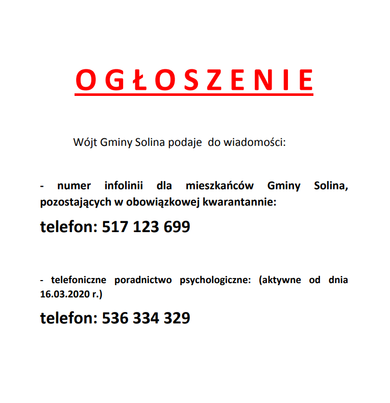 Wójt Gminy Solina podaje do publicznej wiadomości numery infolinii dla mieszkańców Gminy Solina