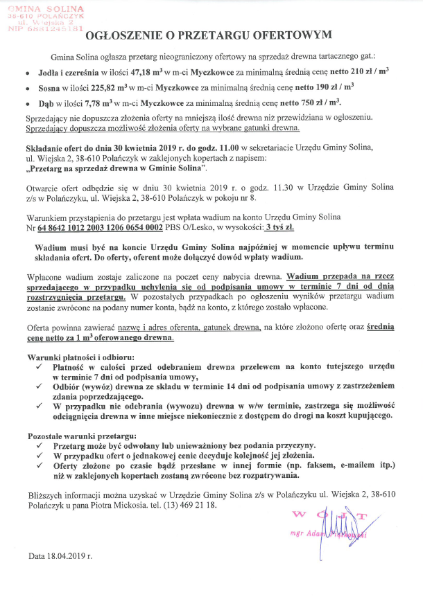 Gmina Solina ogłasza przetarg nieograniczony ofertowy na sprzedaż drewna tartacznego