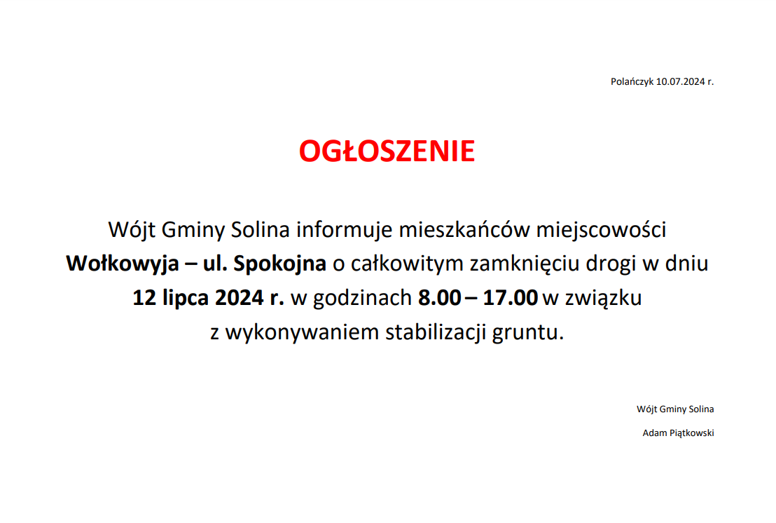 Ogłoszenie o zamknięciu drogi w miejscowości Wołkowyja