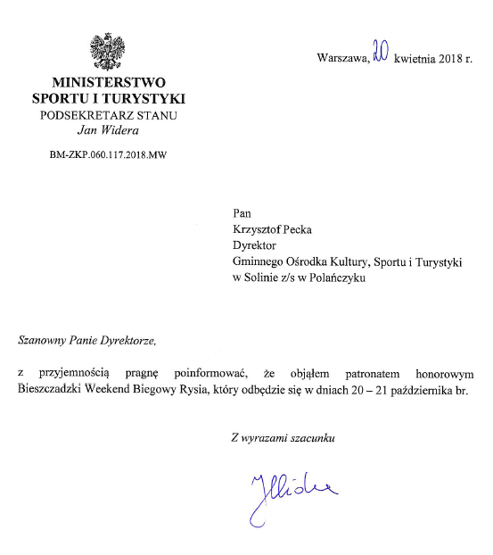 Mamy przyjemność poinformować, iż Ministerstwo Sportu i Turystyki objęło Patronatem Honorowym imprezę sportową „Bieszczadzki Weekend Biegowy Rysia”.