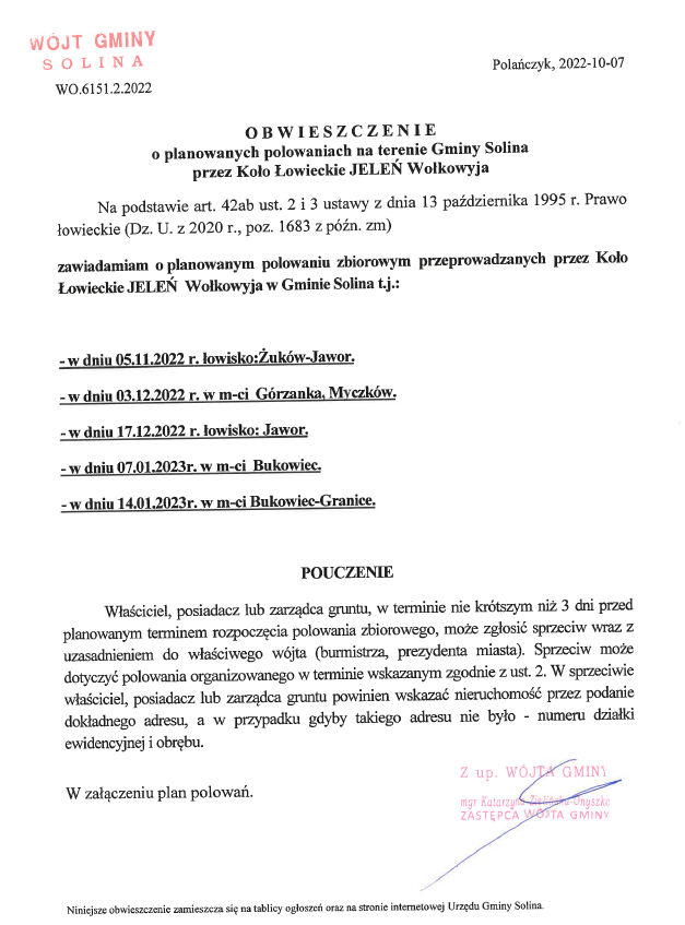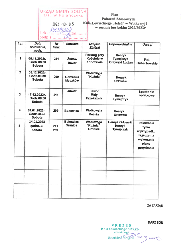 Plan Polowań Zbiorowych Koła Łowieckiego „Jeleń” w Wołkowyi w sezonie łowieckim 2022/2023