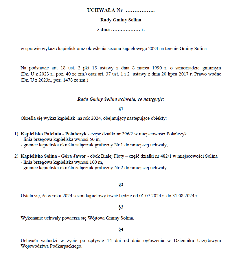 Stosownie do zapisów art. 37 ust. 10 ustawy z dnia 20 lipca 2017 r. Prawo wodne Wójt Gminy Solina podaje do publicznej wiadomości projekty uchwały w sprawie wykazu kąpielisk oraz określenia sezonu kąpielowego 2024 na terenie Gminy Solina.
