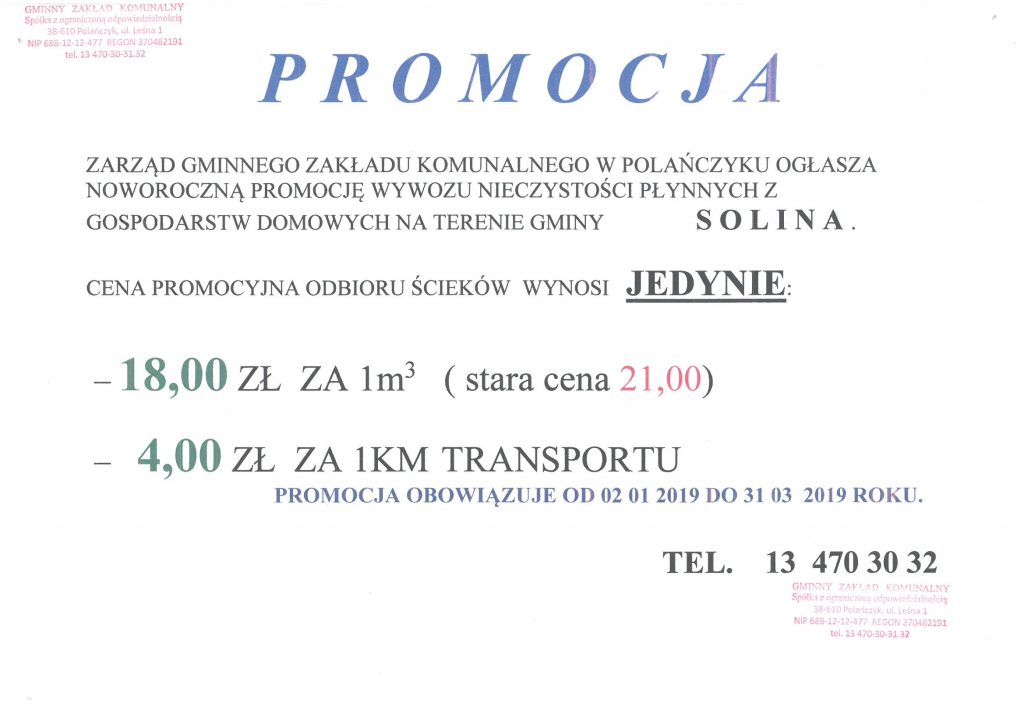 Noworoczna promocja wywozu nieczystości płynnych z gospodarstw domowych na terenie Gminy Solina.