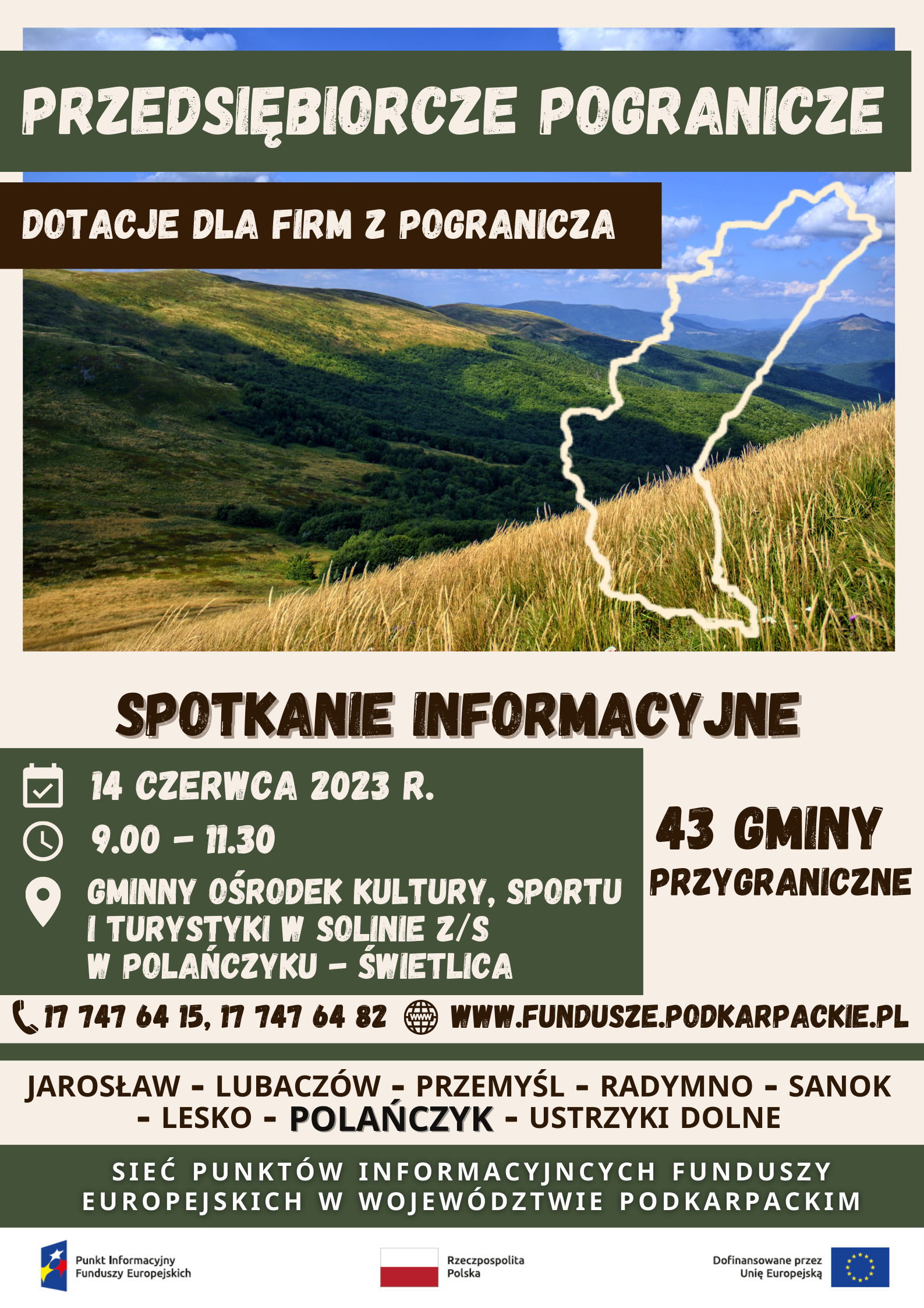 Spotkanie organizowane jest w ramach cyklu bezpłatnych spotkań informacyjnych w ramach akcji „Przedsiębiorcze Pogranicze – dotacje dla firm z pogranicza”. Harmonogram pozostałych spotkań dostępny jest pod adresem: https://tiny.pl/chkpx