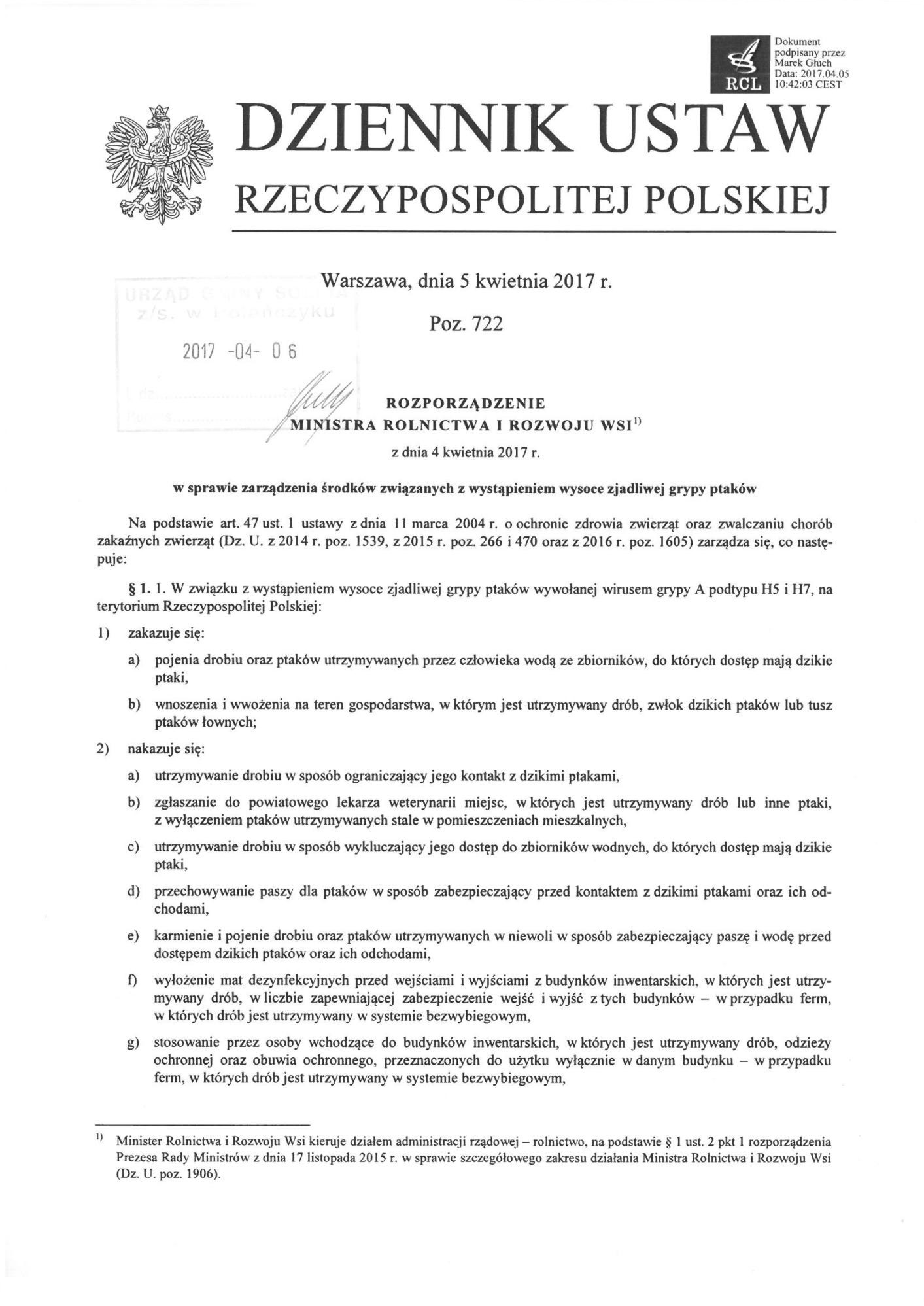 w sprawie zarządzenia środków związanych z wystąpieniem wysoce zjadliwej grypy ptaków
