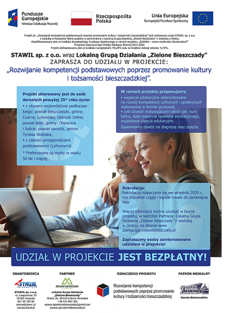 ze środków Europejskiego Funduszu Społecznego w ramach projektu: „SZANSA – nowe możliwości dla dorosłych” Programu Operacyjnego Wiedza Edukacja Rozwój 2014-2020. Projekt jest realizowany przez STAWIL sp. z o.o. z siedzibą w Rzeszowie lidera projektu w partnerstwie z Lokalną Grupą Działania „Zielone Bieszczady” z siedzibą w Orelcu.