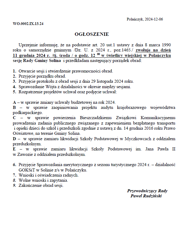Obwieszczenie Wójta Gminy Solina z dnia 24 stycznia 2025 r.