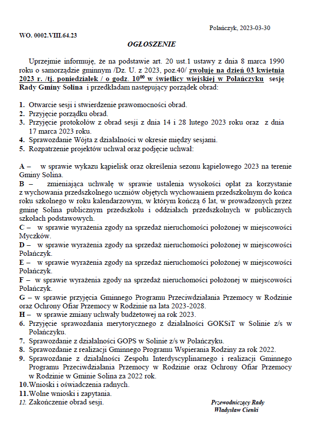 Sesja Rady Gminy Solina – transmisja live