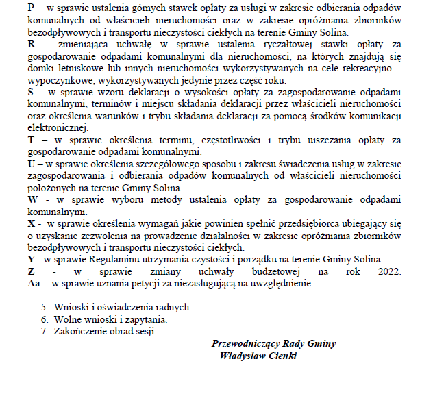 Ogłoszenie o zwołaniu na dzień 15 listopada 2022 roku sesji Rady Gminy Solina