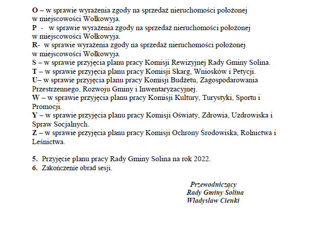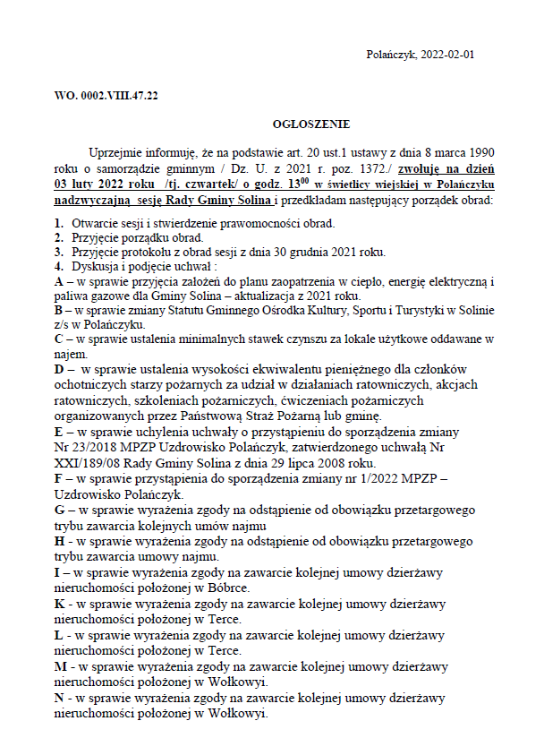 Ogłoszenie o zwołaniu na dzień 3 lutego 2022 roku nadzwyczajnej sesji Rady Gminy Solina