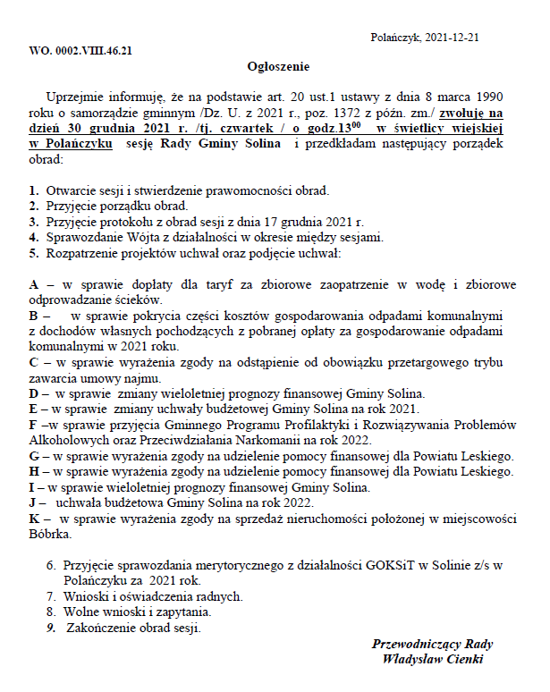 Ogłoszenie o zwołaniu na dzień 30 grudnia 2021 roku sesji Rady Gminy Solina