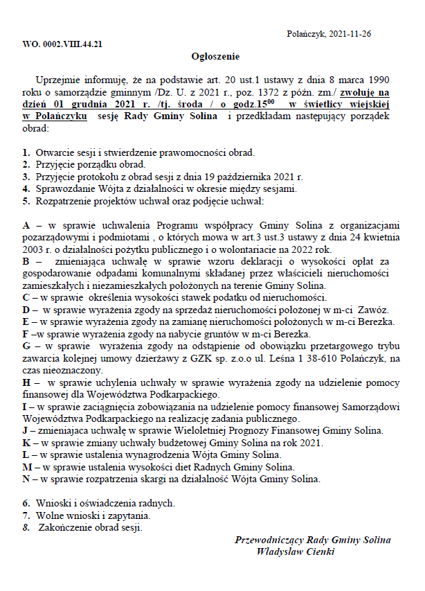 Ogłoszenie o zwołaniu na dzień 1 grudnia 2021 roku sesji Rady Gminy Solina