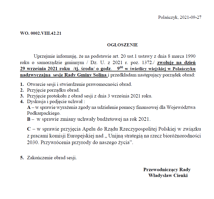 Ogłoszenie o zwołaniu na dzień 29 września 2021 roku nadzwyczajnej sesji Rady Gminy Solina