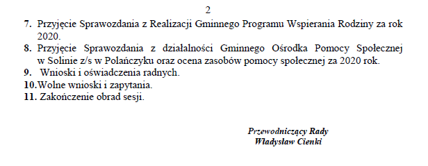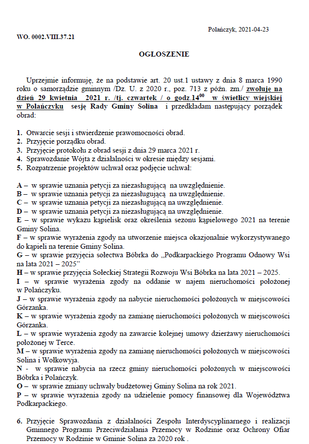 Ogłoszenie o zwołaniu na dzień 29 kwietnia 2021 roku sesji Rady Gminy Solina
