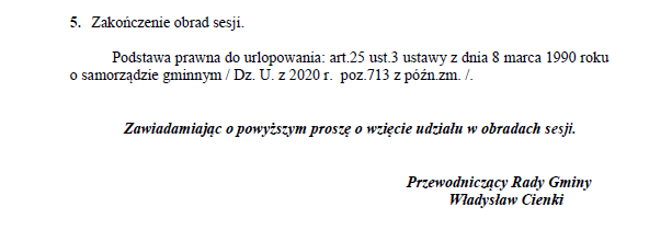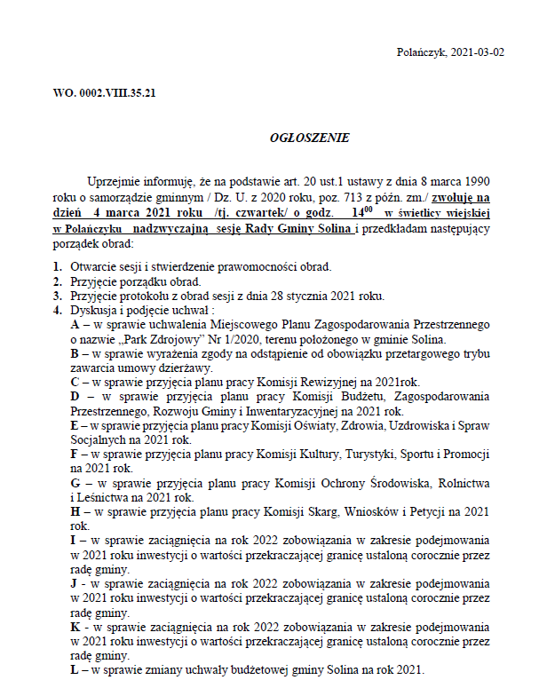 Ogłoszenie o zwołaniu na dzień 4 marca 2021 roku nadzwyczajnej sesji Rady Gminy Solina