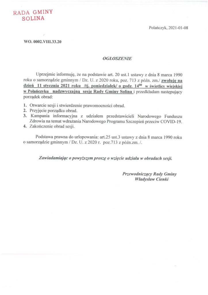 Ogłoszenie o zwołaniu na dzień 11 stycznia 2021 roku Nadzwyczajnej Sesji Rady Gminy Solina