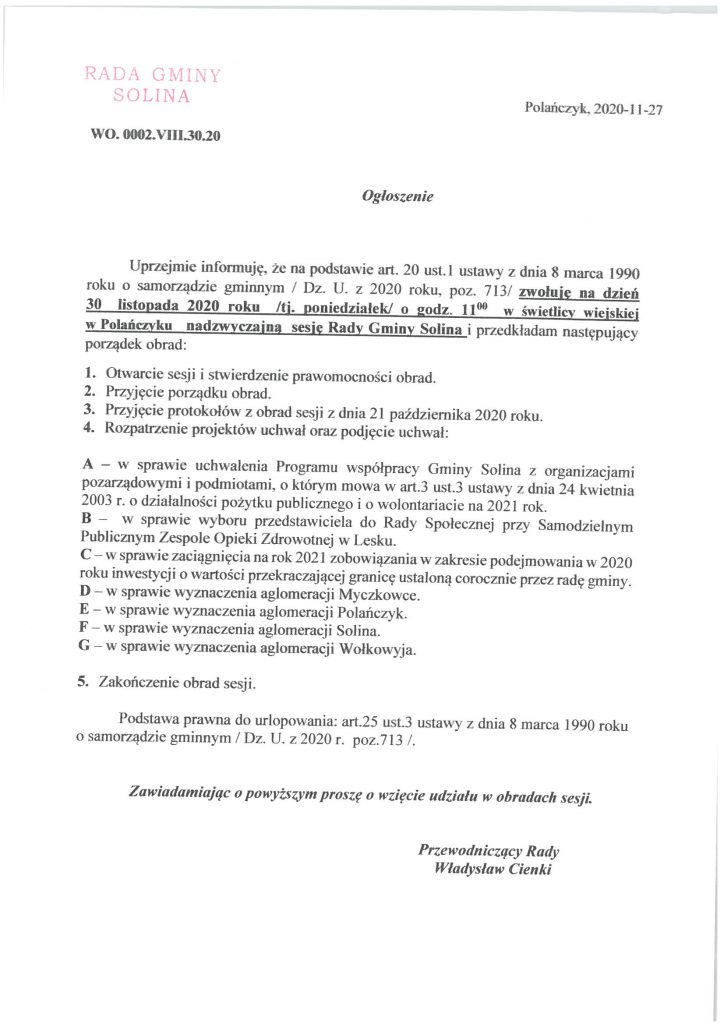 Ogłoszenie o zwołaniu na dzień 30 listopada 2020 roku Nadzwyczajnej Sesji Rady Gminy Solina