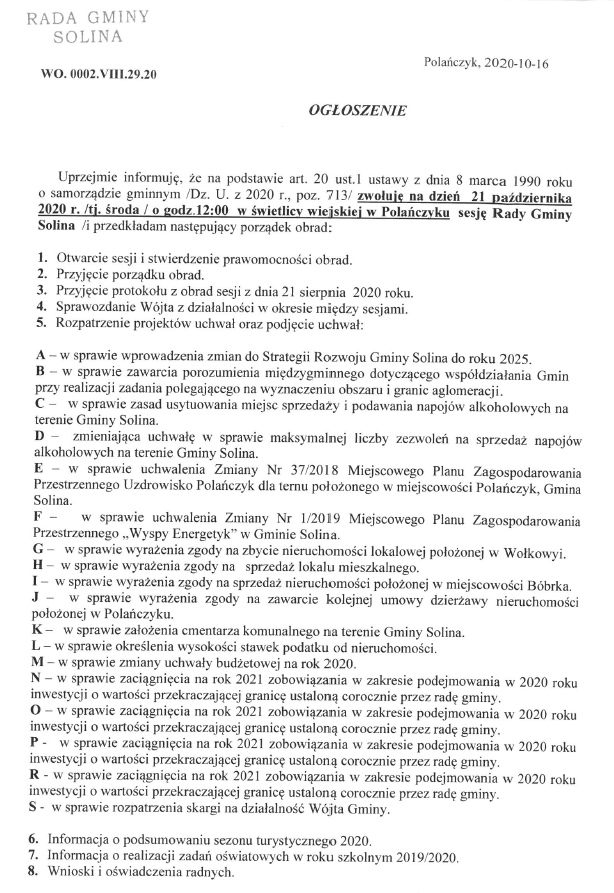 Ogłoszenie o zwołaniu na dzień 21 października 2020 roku Sesji Rady Gminy Solina